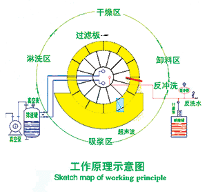 淋洗區(qū):濾餅轉(zhuǎn)出料漿斗后,對(duì)濾餅進(jìn)行噴淋洗滌。